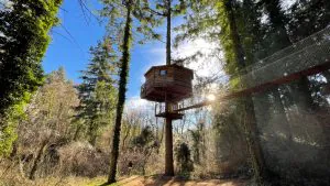 Empezamos en casa, este proyecto inédito, nació en el año 2009. En el entorno mágico de los bosques de Sant Hilari Sacalm, surgió el primer alojamiento de cabañas en los árboles de todo el país. Las cabañas de madera se integran dentro de un paisaje de montañas y bosques situados en el noreste de Cataluña. Allí en lo alto, podéis desconectar del día a día y reconectar con vuestra esencia, con la magia de la naturaleza. ¡Y cumplir un sueño de la infancia, dormir en un árbol! Cada cabaña tiene su vista y su decoración propia. El interior de la cabaña es cálido y cómodo. En el exterior, una terraza para apreciar el paisaje y disfrutar de un desayuno en contacto con la naturaleza. Adaptadas a la medida del árbol que las sostiene, las cabañas son de forma octogonal y tienen 30 m² de superficie.